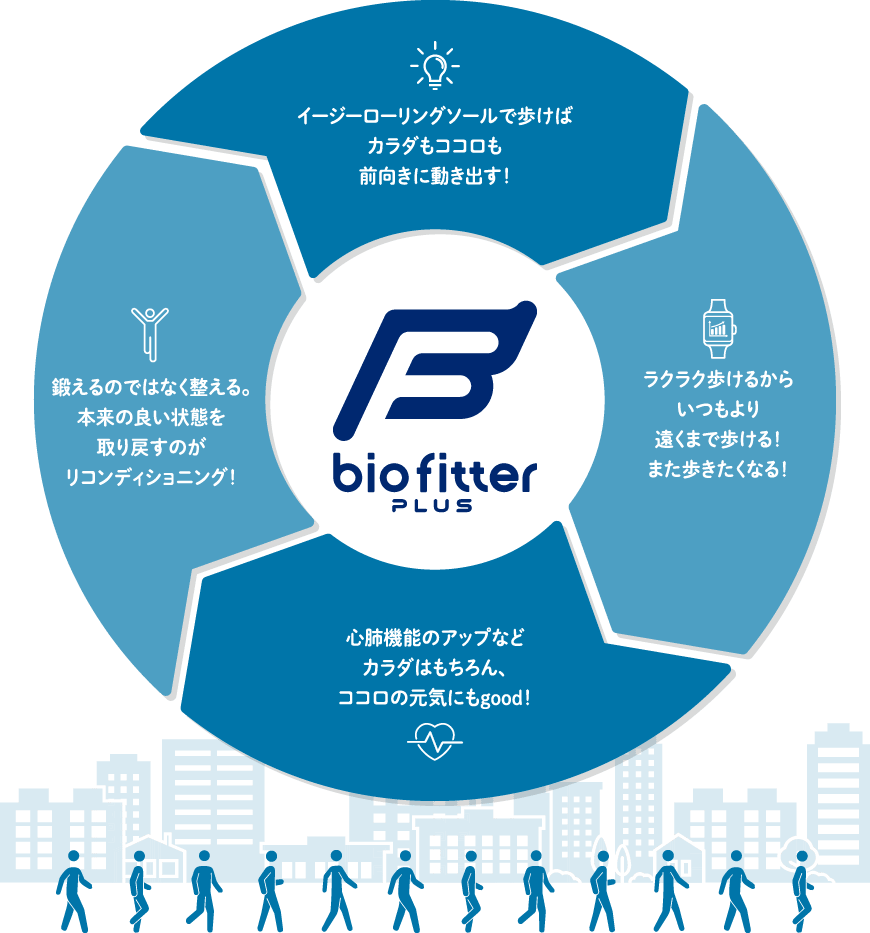 リコンディショニングとは、体調を整え、本来の良い状態を取り戻すことを指します。体を動かす機会が減り、体力の衰えを感じることが増え、失われた健康・体力を取り戻したいと考えるがなかなかきっかけがつかめずにいる。バイオフィッター プラスは、そんな方々に向けてリコンディショニングシューズとして開発されました。