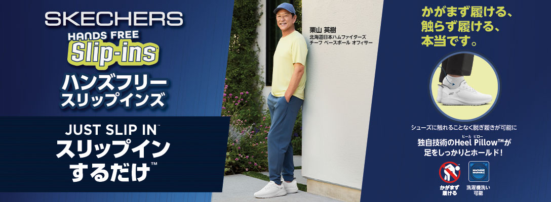 ハンズフリーで履けるSKECHERS Slip-ins(スケッチャーズ スリップ・インズ)シリーズは、靴べらのようなかかとで立ったままでも座ったままでも手を使わずにスッと履ける、画期的なシューズです。