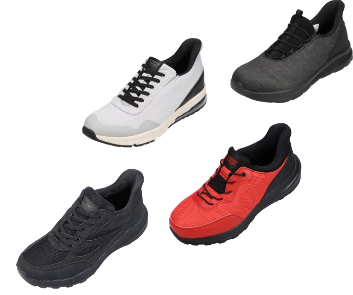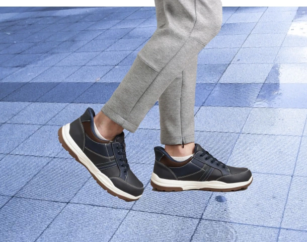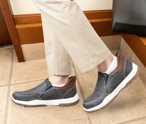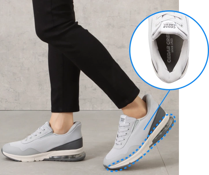 ソールにはエアーを、インソールには厚みと弾力性のあるポリウレタン発泡素材を使用で歩行の衝撃から足をサポートし、長く履いても疲れにくい。
