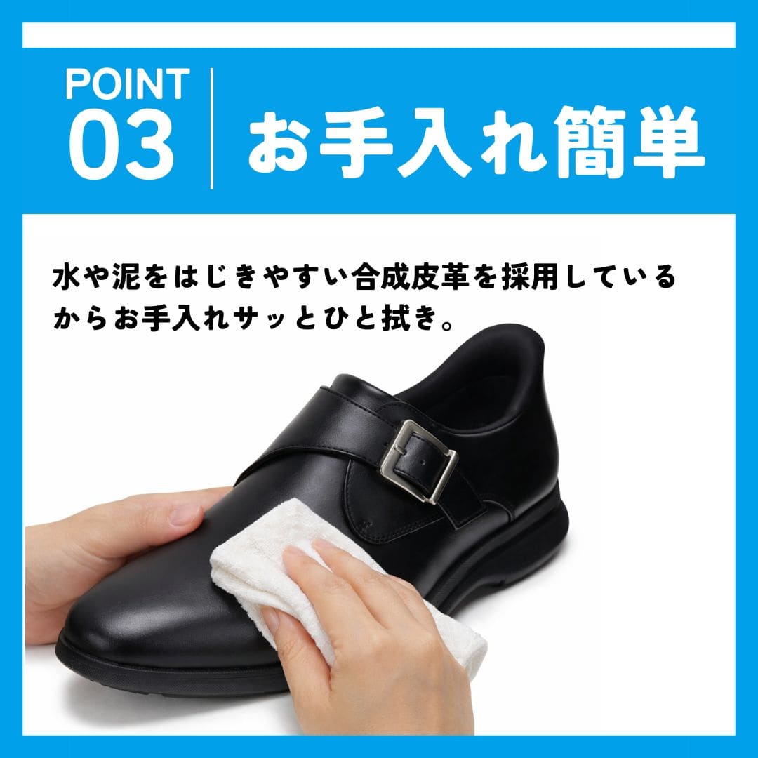 アッパーには水や泥をはじきやすい合成皮革を採用しているため、お手入れはサッとひと拭きで簡単です。