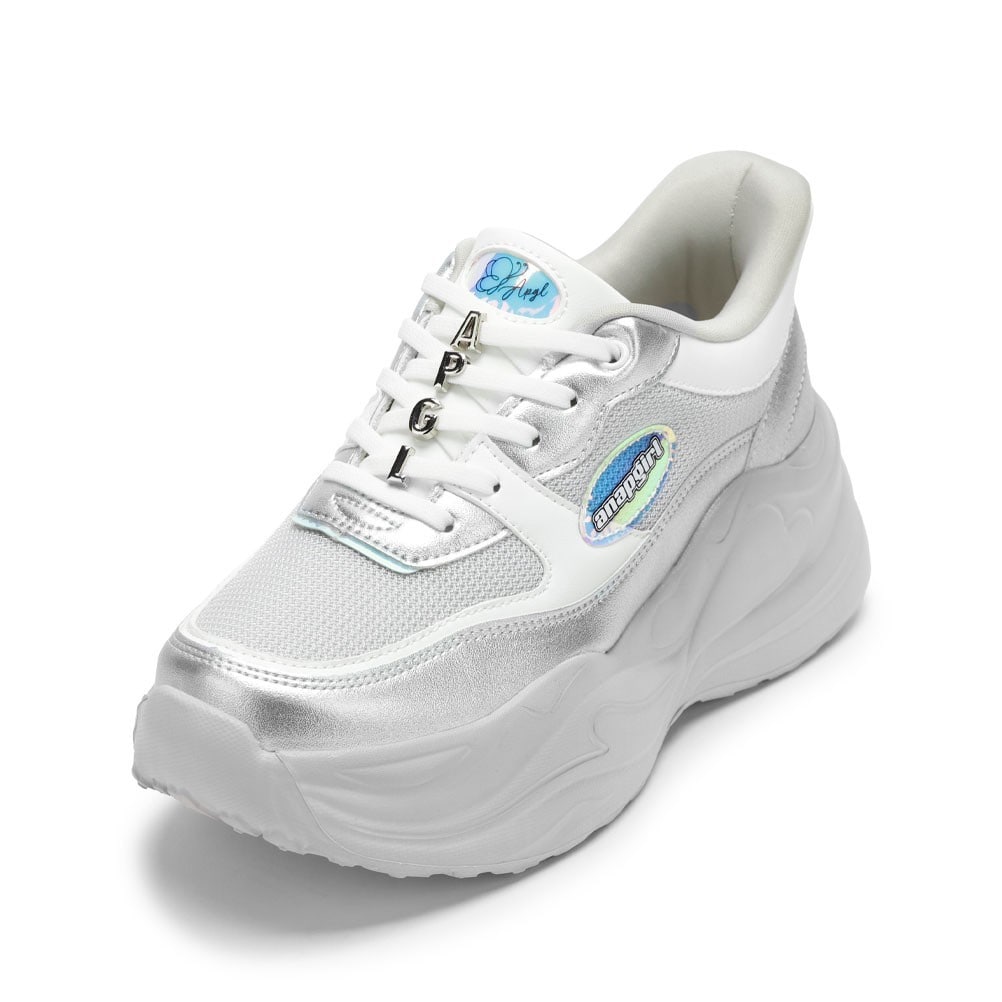 メタリック配色とロゴデザインが足元のアクセントになり、カジュアルコーデを今っぽく格上げします。