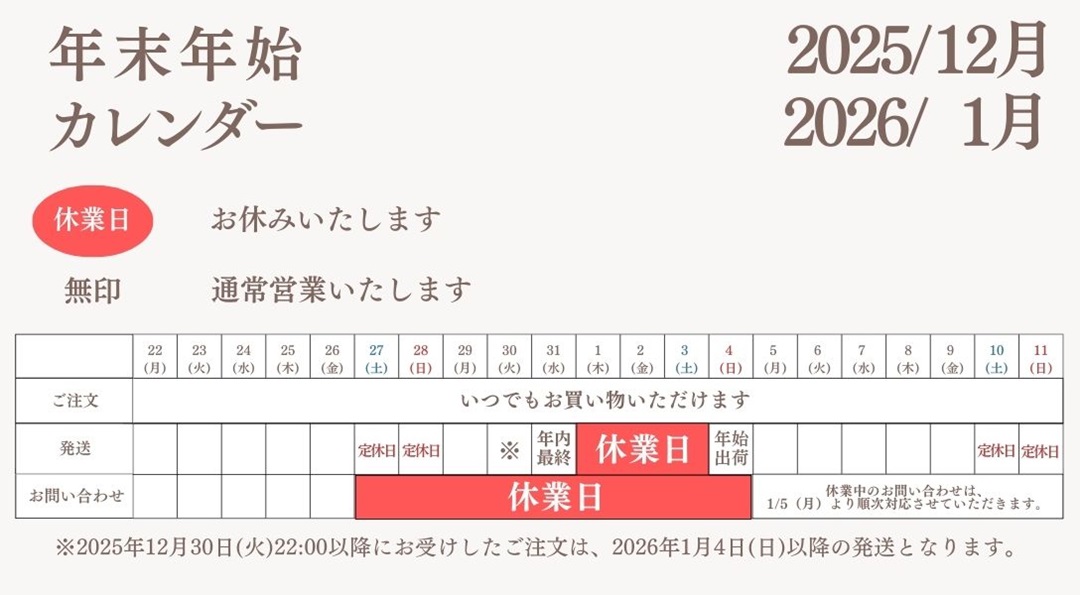年末年始における、発送ならびに応対業務の営業スケジュールについてご案内いたします。